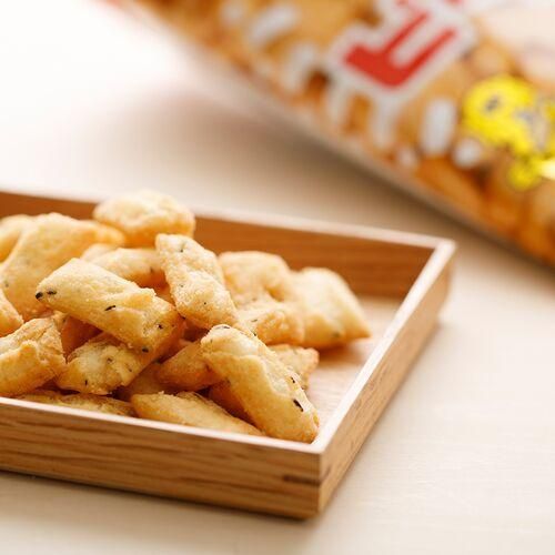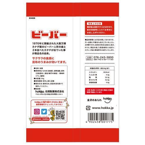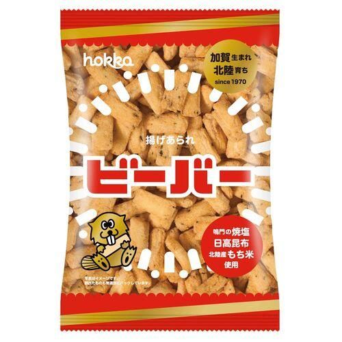1970年の発売以来、北陸で長く愛されつづけている「ビーバー」。当時からのレシピと製法を忠実に引き継ぎ、「日高昆布」を「北陸産もち米」に練り込んでいます。「鳴門の焼塩」を効かせた伝統の味は、サクサクの食感と昆布の旨味がポイント。なお「ビーバー」という商品名は、1970年に開催された大阪万博のカナダ館にて展示されていたビーバー人形の歯と、お菓子を2 本並べたカタチが似ていた事が商品名の由来となりました。