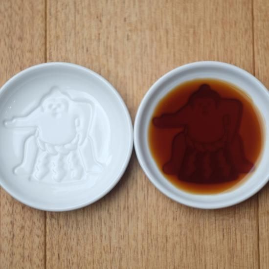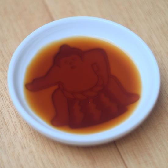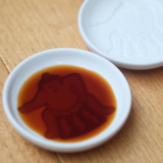 お相撲さんの醤油皿です。醤油を注ぐと、イラストが浮かびあがります。